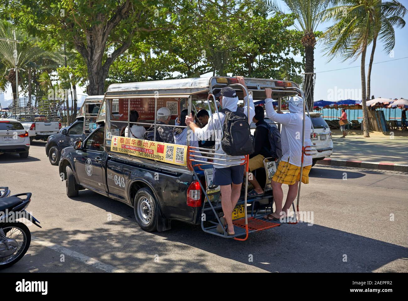 A songthaew (Thai: สองแถว, lit. 'two rows', RTGS: songthaeo, pronounced [sɔ̌ːŋ.tʰɛ̌w]; Lao: ສອງແຖວ, pronounced [sɔ̌ːŋ.tʰɛ́w]; is a passenger vehicle in Thailand and Laos adapted from a pick-up or a larger truck and used as a share taxi or bus.